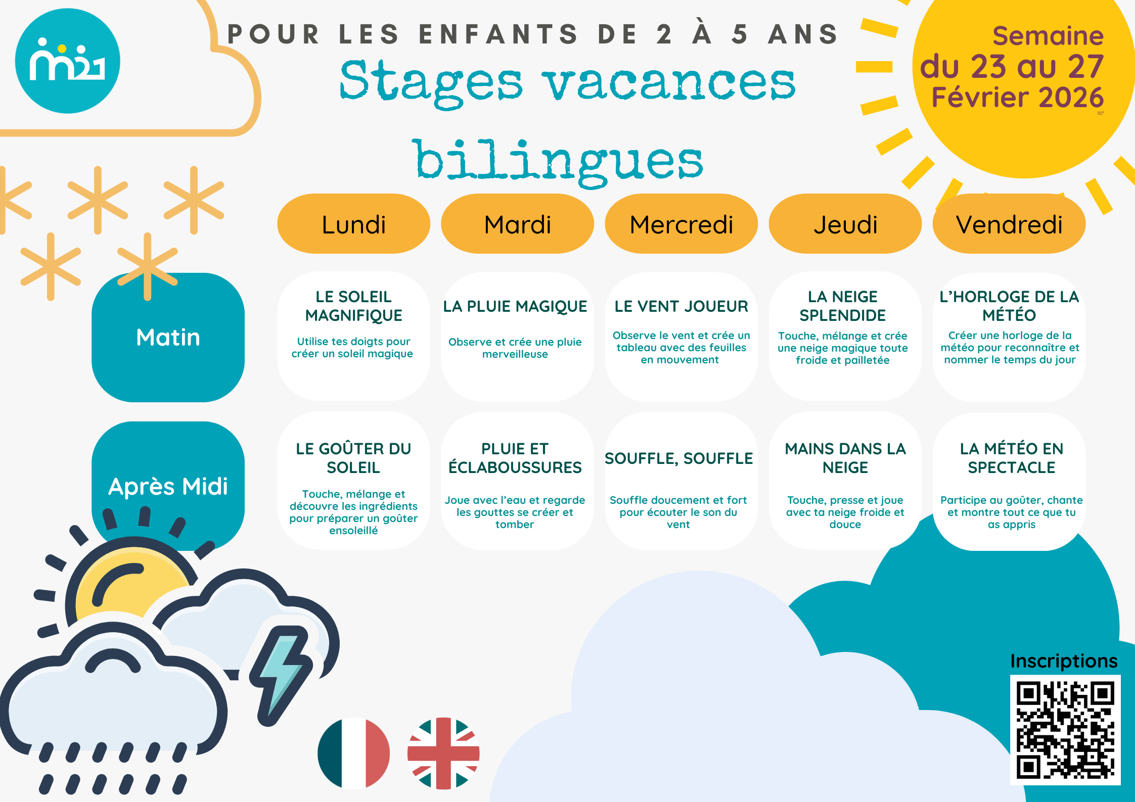 Pendant une semaine, nos éducateurs proposeront une immersion totale en français et en anglais autour d’un thème fascinant : les phénomènes météorologiques. À travers des expériences sensorielles et des ateliers créatifs, les enfants apprendront à observer et comprendre le temps qu’il fait.