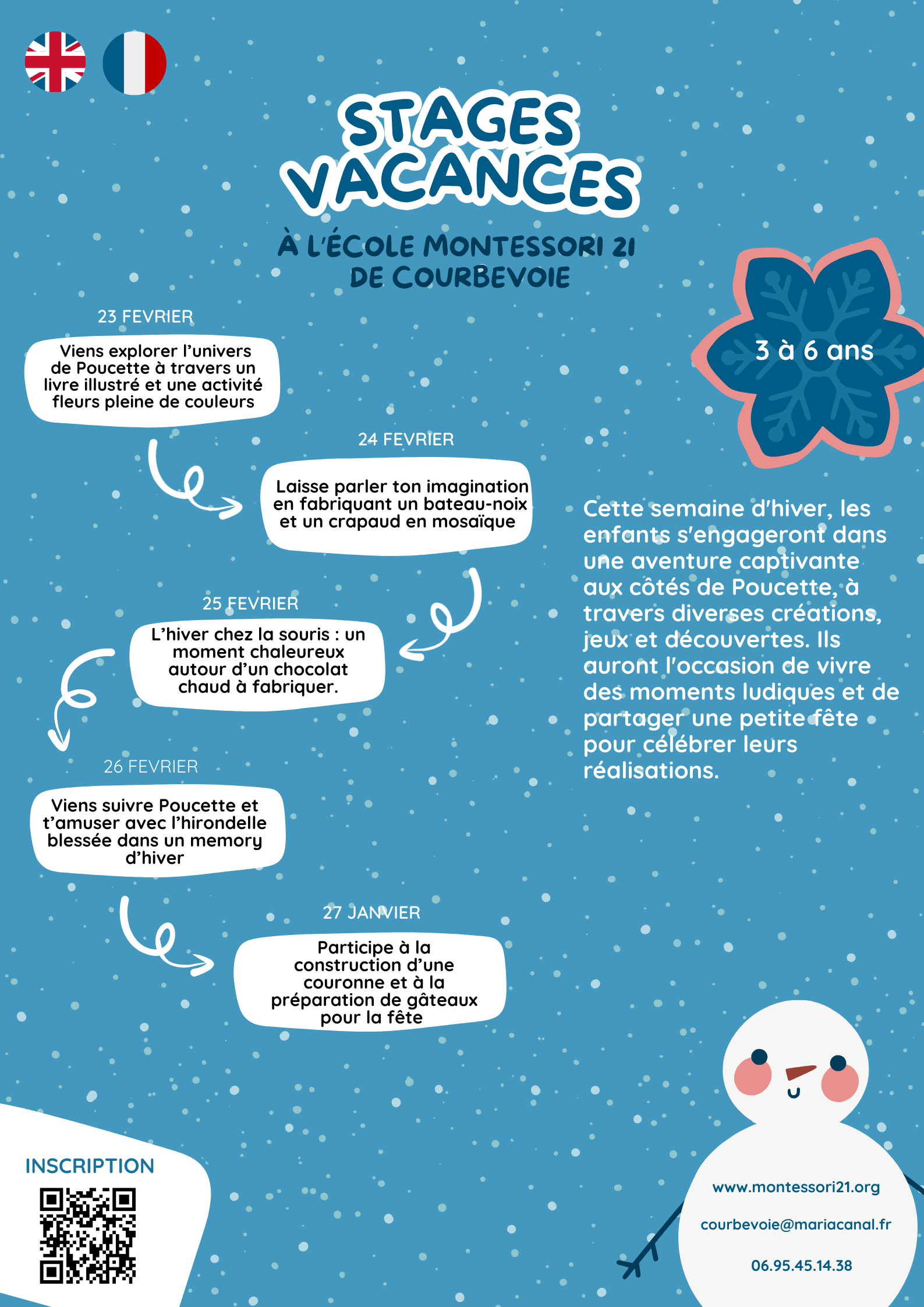 Cet hiver, l’école Montessori 21 de Courbevoie ouvre ses portes pour une semaine de stages bilingues (français/anglais) du 23 au 27 février. Nous proposons deux parcours adaptés selon l’âge de vos enfants, mêlant créativité, découvertes ludiques et esprit de fête.
