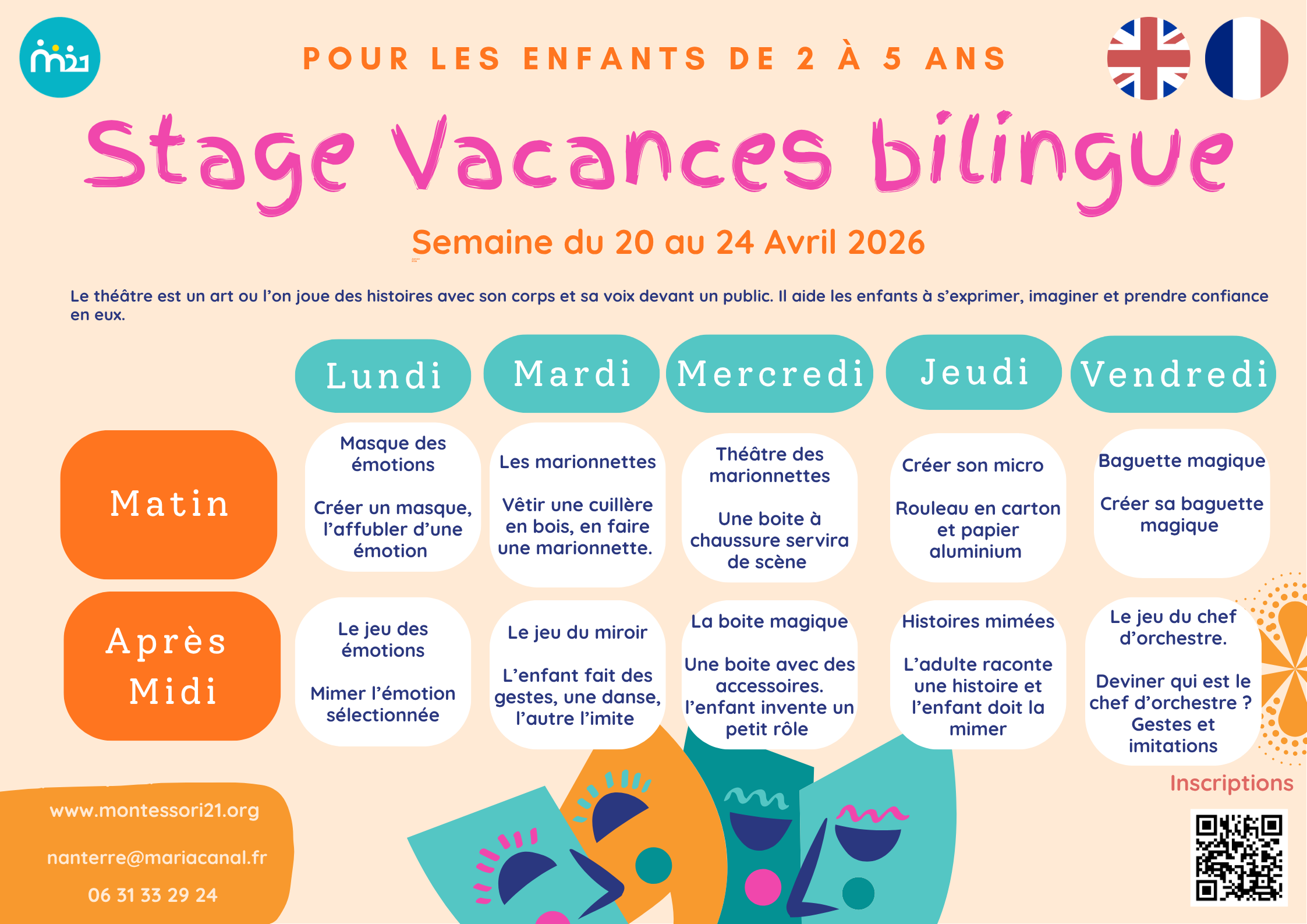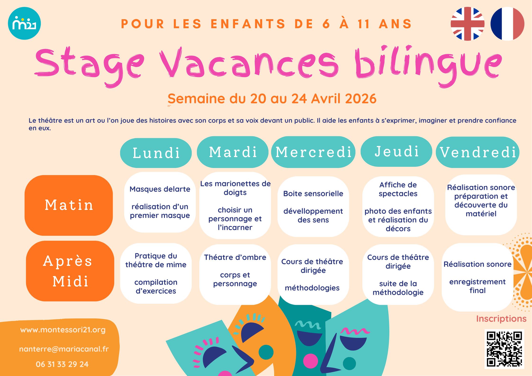 Du 20 au 24 avril 2026, l’école Montessori 21 de Nanterre ouvre ses rideaux pour une semaine dédiée à l’art dramatique. Le théâtre est un merveilleux outil pour aider les enfants à s’exprimer, imaginer et prendre confiance en eux, tout en pratiquant l’anglais et le français.