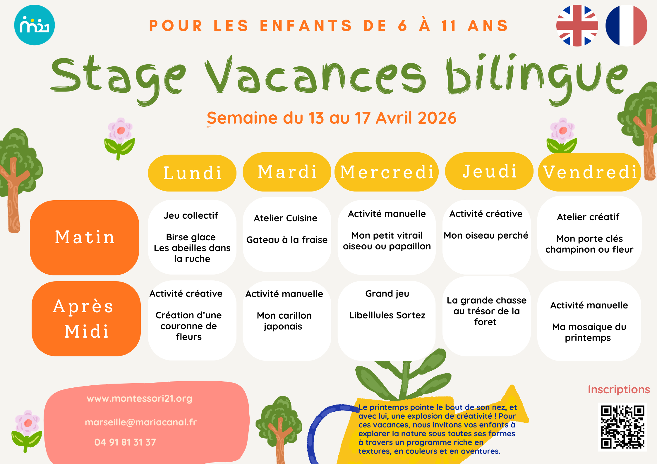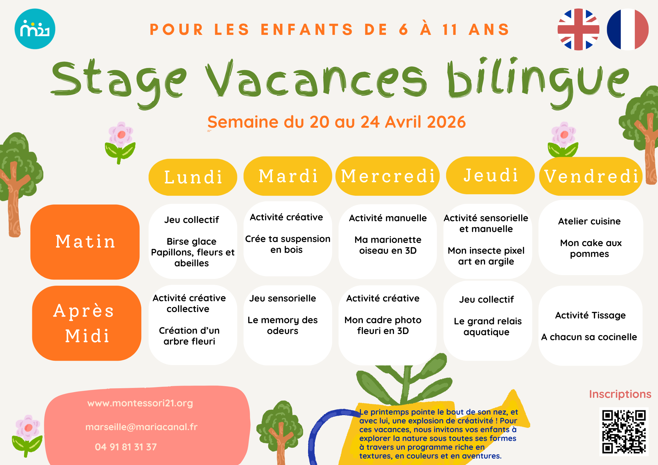 Informations pratiques du périscolaire Montessori 21 de Marseille pendant les vacances