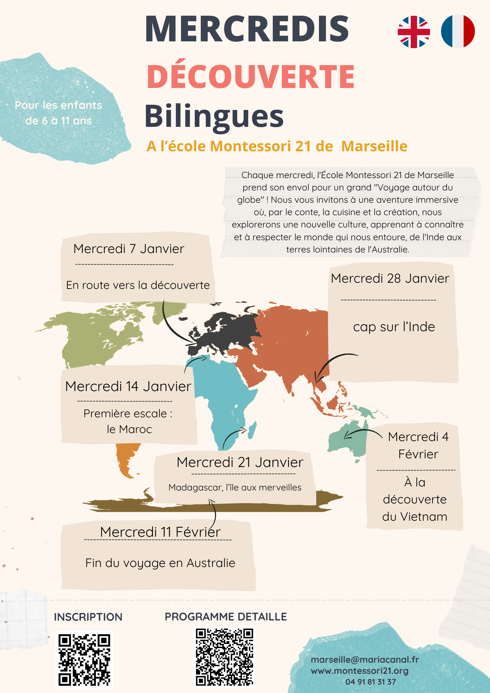 Chaque mercredi, l’École Montessori 21 de Marseille prend son envol pour un grand “Voyage autour du globe” ! Nous vous invitons à une aventure immersive où, par le conte, la cuisine et la création, nous explorerons une nouvelle culture, apprenant à connaître et à respecter le monde qui nous entoure, de l’Inde aux terres lointaines de l’Australie.