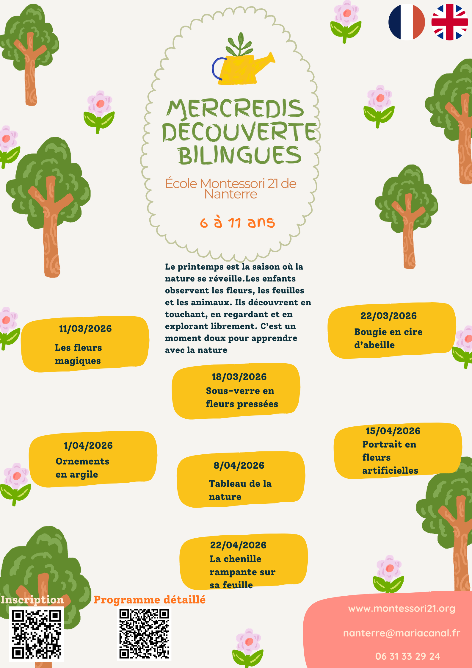 Le printemps arrive à l’école Montessori 21 de Nanterre ! C’est la saison idéale pour observer les fleurs, les feuilles et les animaux qui s’éveillent. À travers nos ateliers bilingues, nous proposons aux enfants un moment doux pour apprendre avec la nature, en touchant, en regardant et en explorant librement.